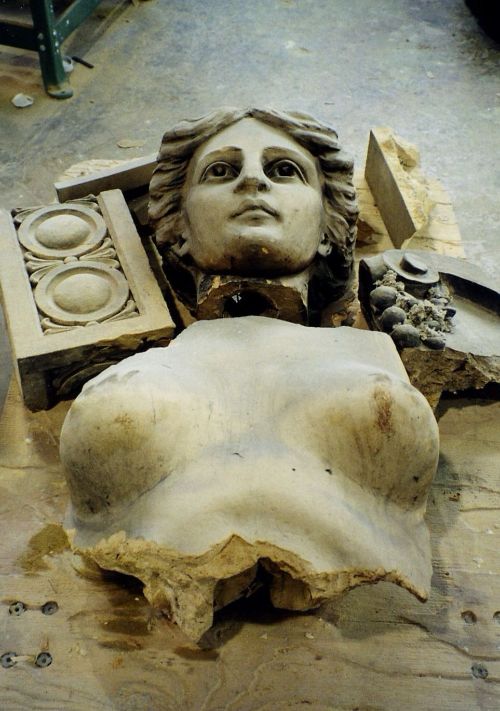 Luckily, in 1998, the building was saved by the city of Knoxville and the Knoxville Utilities Board, and a painstaking restoration was begun. Utilizing historic photos, along with several site visits to Knoxville to collect field dimensions and small shards of the original terra cotta, we were able to reconstruct a wide array of models and molds for capitals, corbels, and the female caryatid elements that support the entablature above one elevation. We even painstakingly sculpted enlarged versions of several shapes for use in an interior courtyard. If we were doing this today we would simply scan and digitize the originals and enlarge them to the desired size electronically to machine new patterns as needed, but this was back in the dark ages before Y2K.