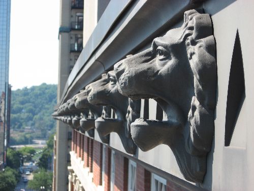 We recreated parts in multiple materials to replace numerous decorative façade elements original to the building, utilizing both pre-cast solid concrete elements and thin-shelled glass fiber reinforced units. The bulk of the work, including the cornice and caryatids, were created with thin-shelled glass fiber materials. The caryatids, the figures eternally holding the building’s cornice in place, had been taken off the building and discarded during the steel envelope. We found one gathering dust in a downtown warehouse and used it to recreate the missing busts.